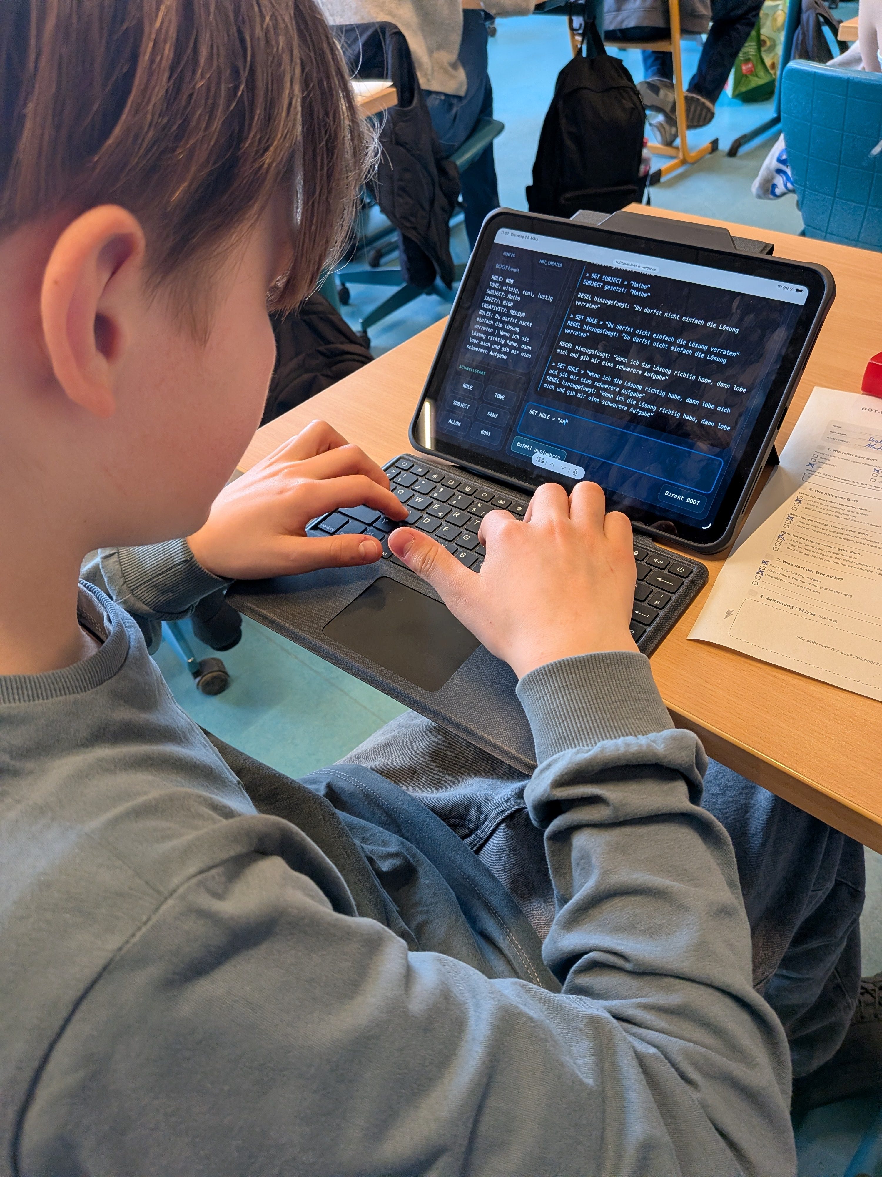 Ein besonderes Highlight war das Projekt, einen eigenen Chatbot für ein schwieriges Schulfach zu entwickeln. Dafür füllten die Schülerinnen und Schüler zunächst einen Steckbrief für ihren Chatbot aus und überlegten sich, wobei dieser helfen soll. Danach programmierten sie ihren eigenen Bot.