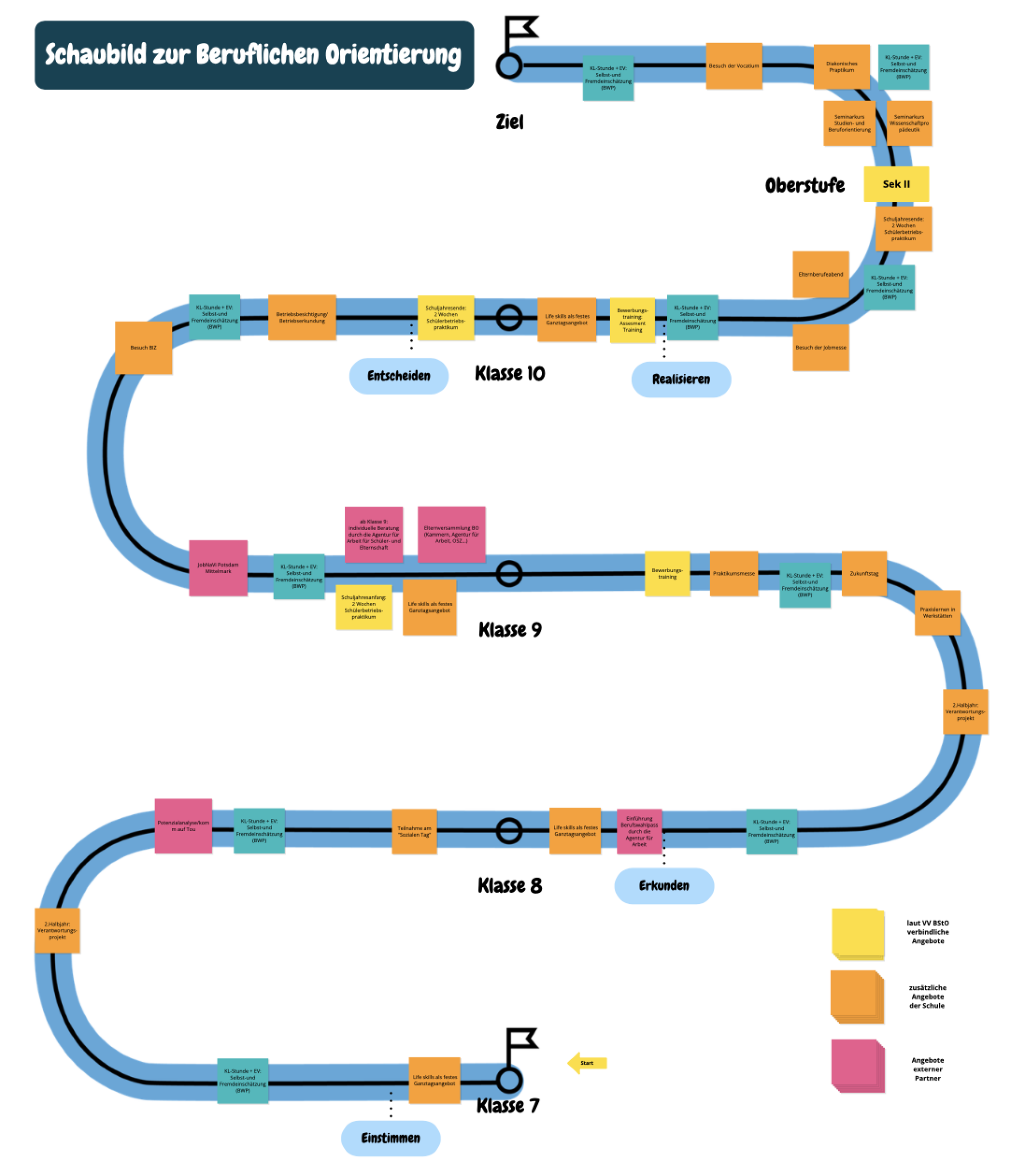 Die Berufs- und Studienorientierung sind als zentraler Bildungsinhalt durch die VV BStO fest im Lehrplan verankert. Dem wollen wir Rechnung tragen und bieten unserer Schülerschaft neben den entsprechenden Inhalten des Faches WAT weitere schulische und außerschulische Möglichkeiten, wichtige Impulse für ihr späteres Berufsleben zu erlangen: