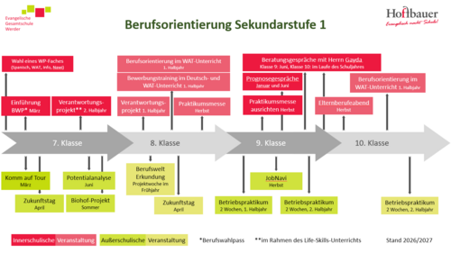 Die Berufs- und Studienorientierung sind als zentraler Bildungsinhalt durch die VV BStO fest im Lehrplan verankert. Dem wollen wir Rechnung tragen und bieten unserer Schülerschaft neben den entsprechenden Inhalten des Faches WAT weitere schulische und außerschulische Möglichkeiten, wichtige Impulse für ihr späteres Berufsleben zu erlangen: